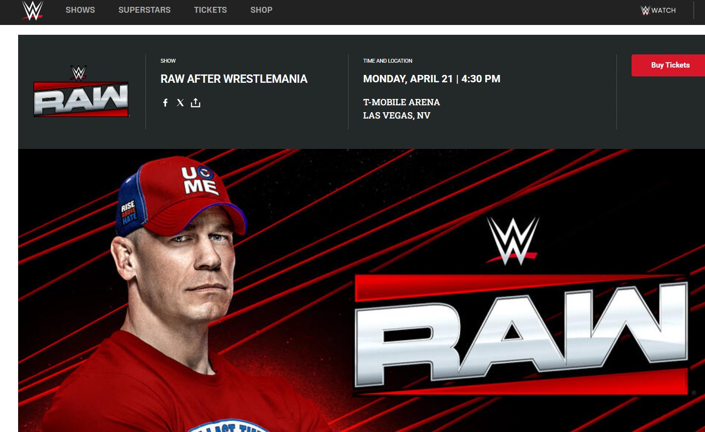 The confusion is understandable. Both WrestleMania 41 (2025) and WrestleMania 42 (2026) are taking place in Las Vegas at Allegiant Stadium. Raw after WrestleMania 41 was indeed held at the T-Mobile Arena on April 21, 2025. It now appears the circulating landing page is either an active leftover from last year or a cached page still being picked up by search engines.